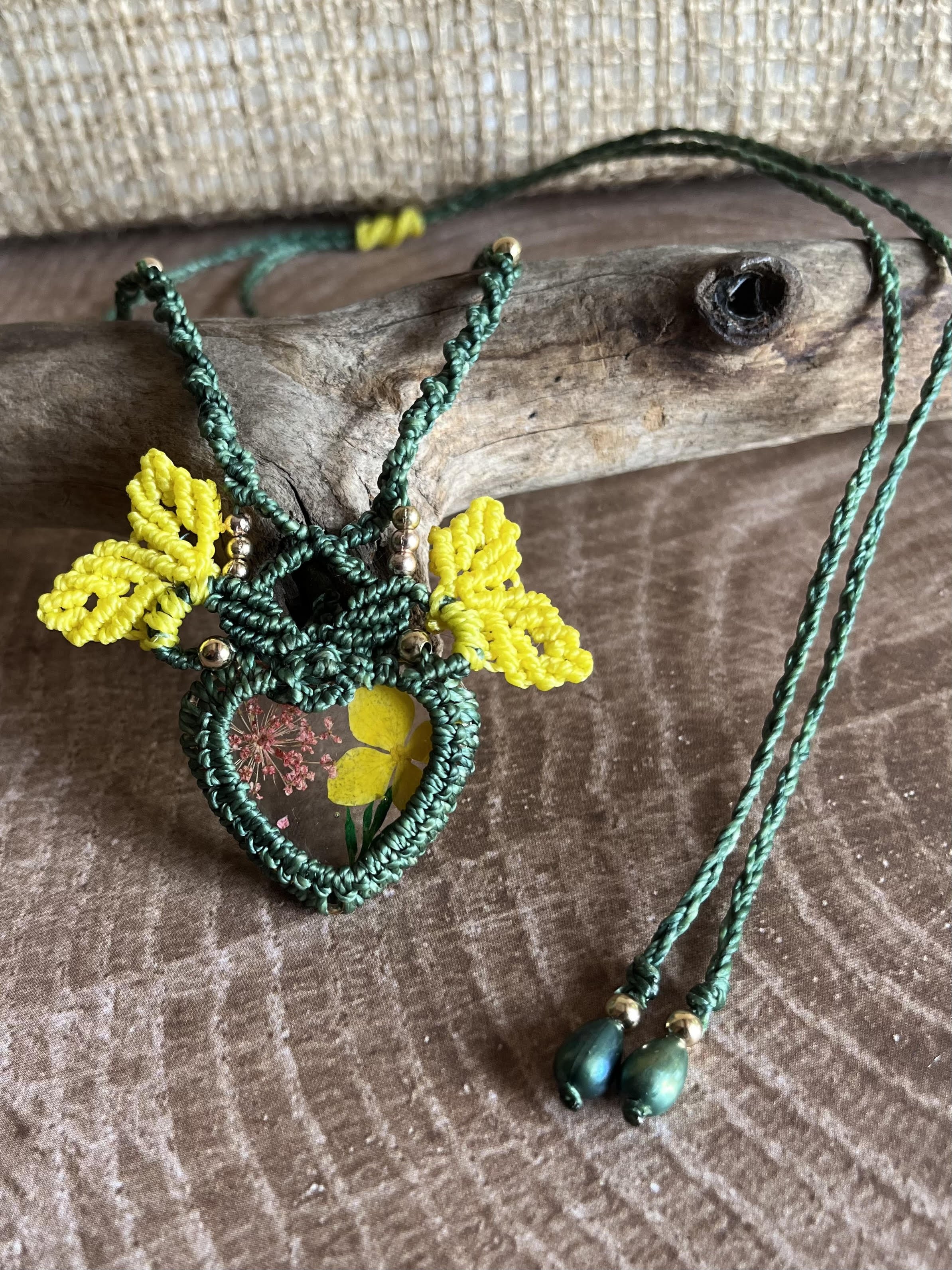 Shop › Green and Yellow Macrame Necklace with Dried Flower Pendant Image 1 of 3 Image 2 of 3 Image 3 of 3 Green and Yellow Macrame Necklace with Dried Flower Pendant $35.00 Pressed dried flowers in a heart-shaped glass pendant.Colors: Green, YellowSize: Adjustable Add To Cart Added! Pressed dried flowers in a heart-shaped glass pendant.Colors: Green, YellowSize: Adjustable